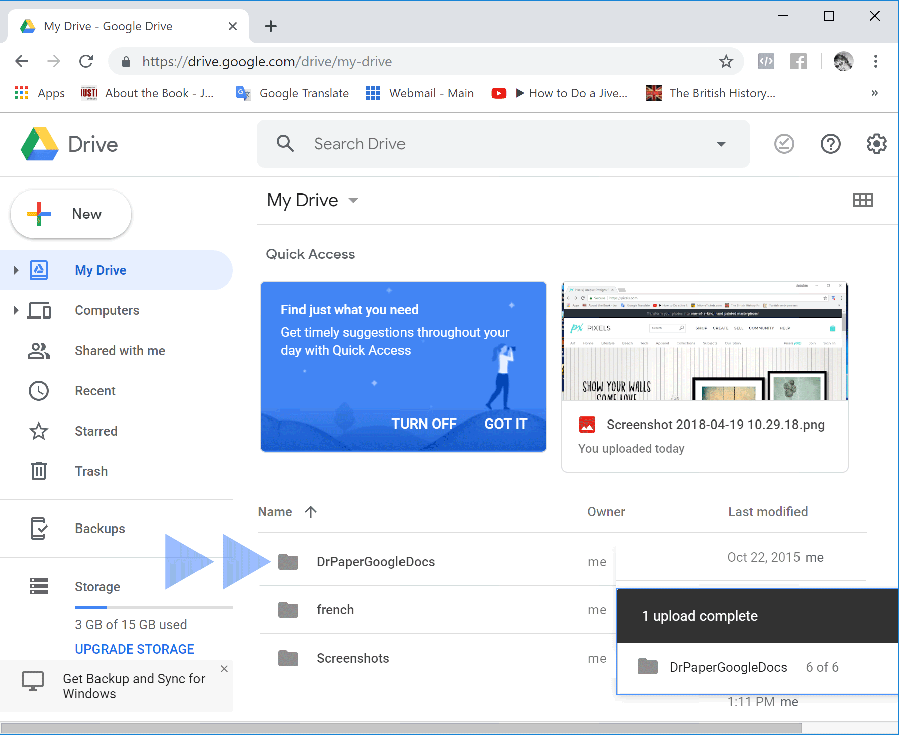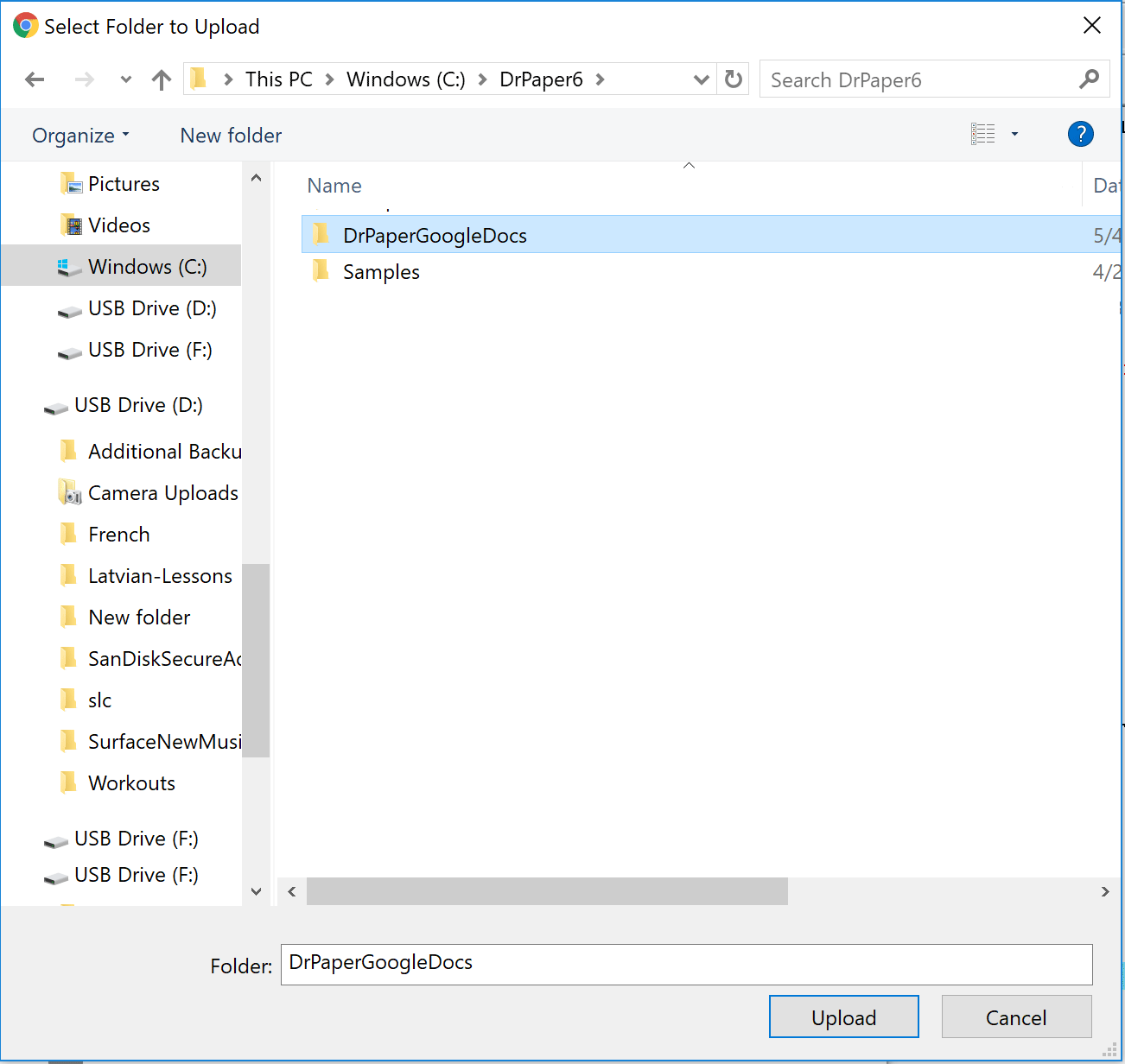 the DrPaperGoogleDocs folder, and click the Upload folder button.