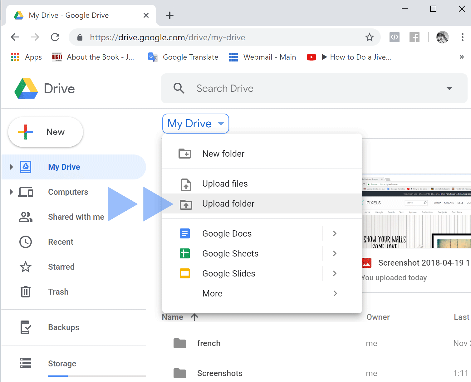 2. In Google Drive, choose Upload folder.