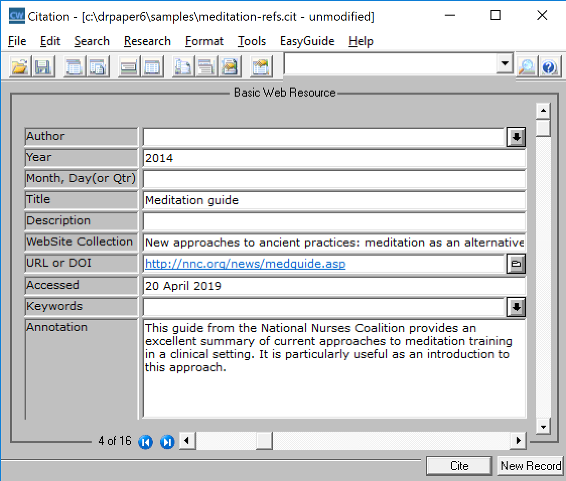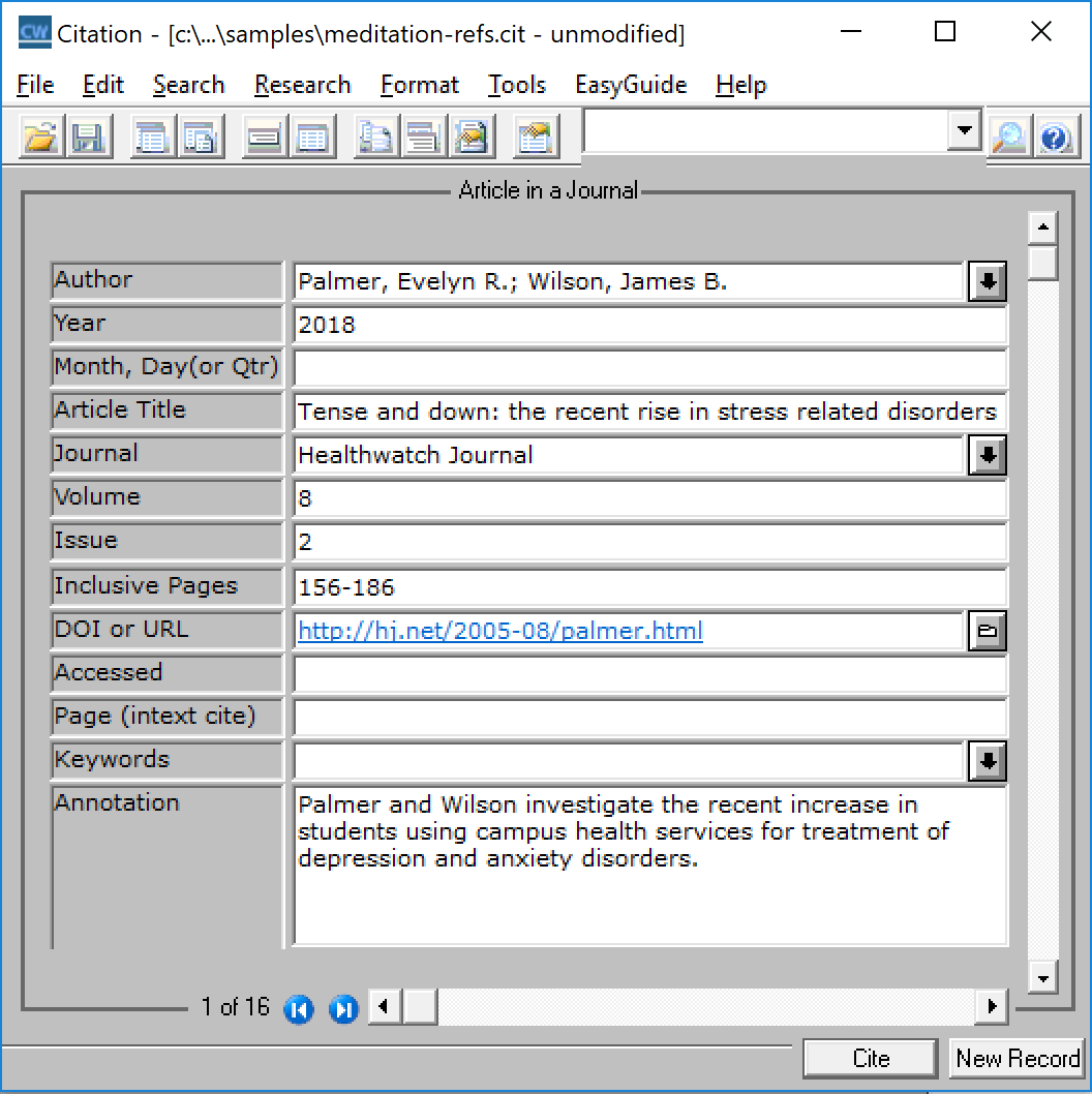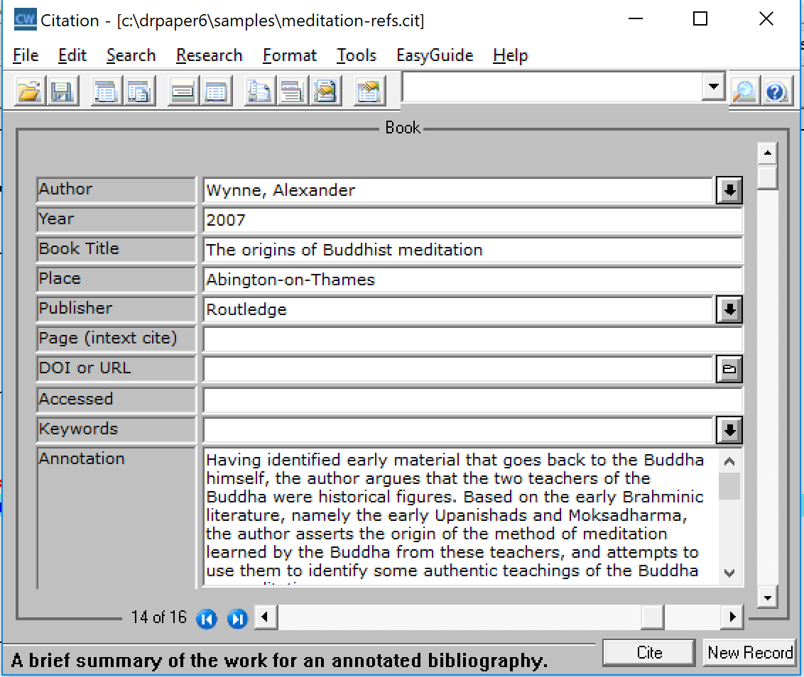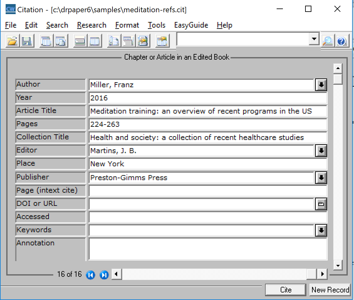 Also, installed with Dr Paper Software on your PC is a handy app for storing and formatting the bibliographic information for your sources. Once you have entered the information into the app, you will be able to format your in-text cites, footnotes, and reference lists for your paper, easily and correctly. After you have created a datafile, you can use Citation to store bibliographic information for any of the works you need to cite in your paper. What follows are a few examples of bibliographic records. Additional SamplesAdditional samples for most types of source materials are on the Dr Paper Help site.