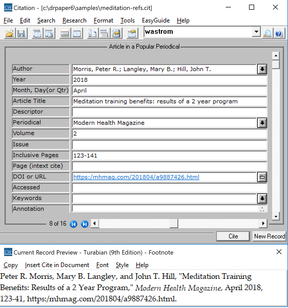 Citation will display the record in the Edit Panel as an in-text