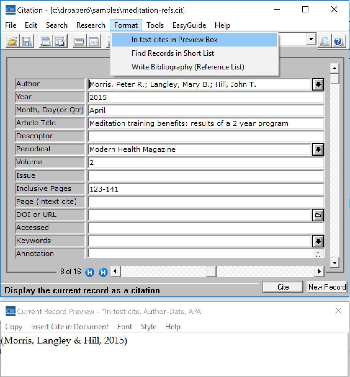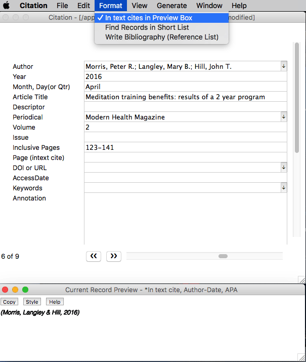 Using the Citation App: Set the Style for In-text Cites As you are writing, you will want to have your Citation datafile open and set to the