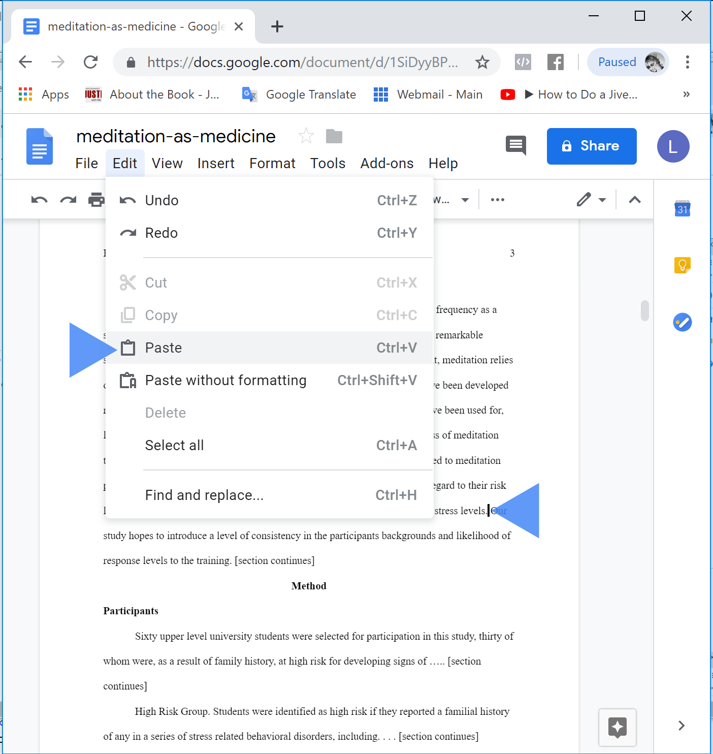 Go to Google Docs. In your document, place your cursor to place the cite, and click Edit, Paste.