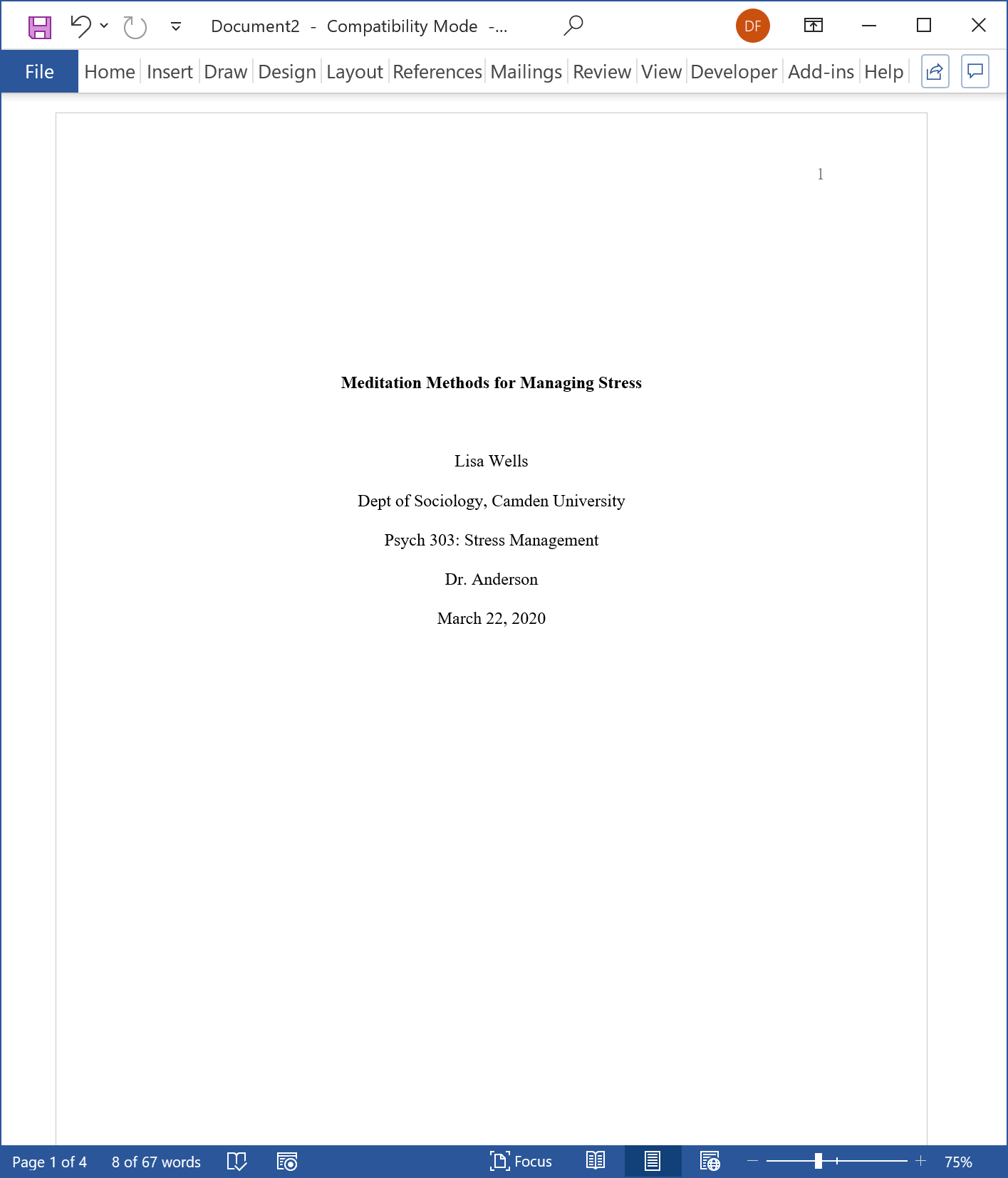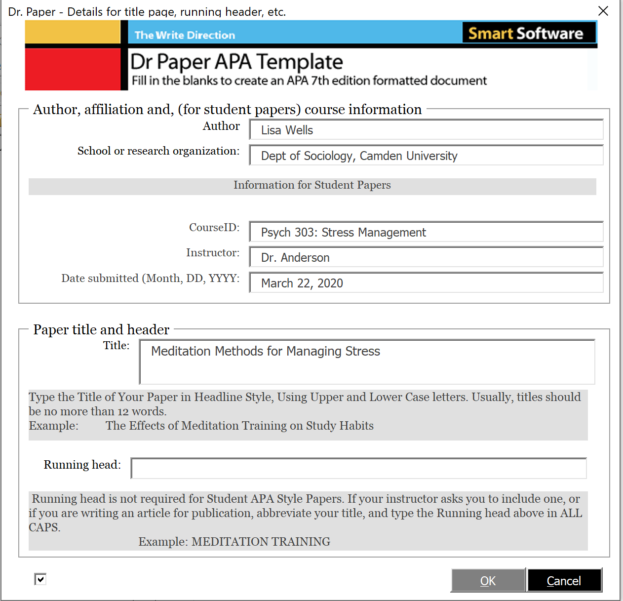 When you click OK, Dr Paper creates a Word document in perfect APA format (you can choose to use the 6th or 7th edition), with your cover page, page numbers and page headers correctly positioned, section heading styles ready to use.