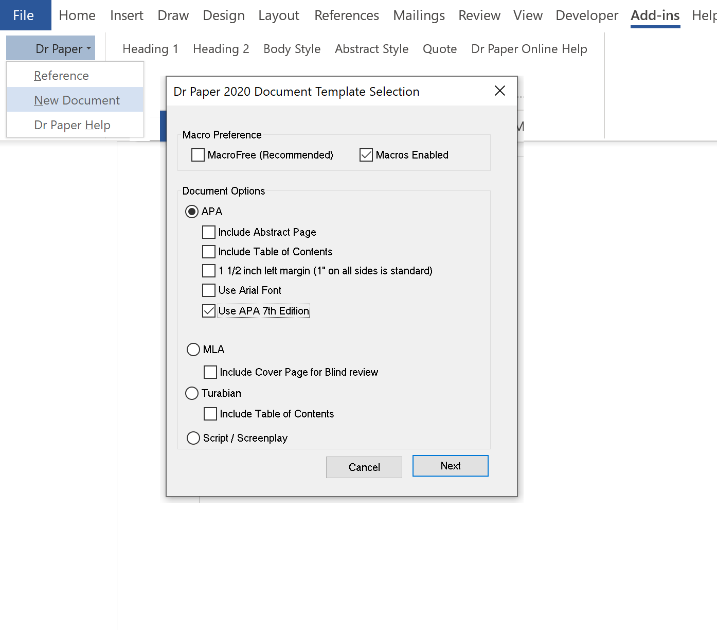 Dr Paper installs on your Word menu, so you just have to click Add-ins > Dr Paper > New Document.
